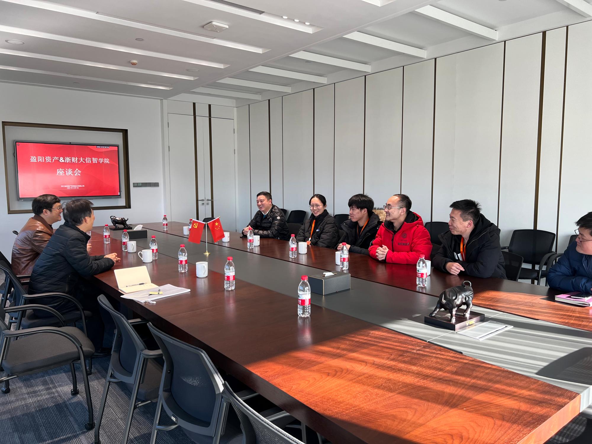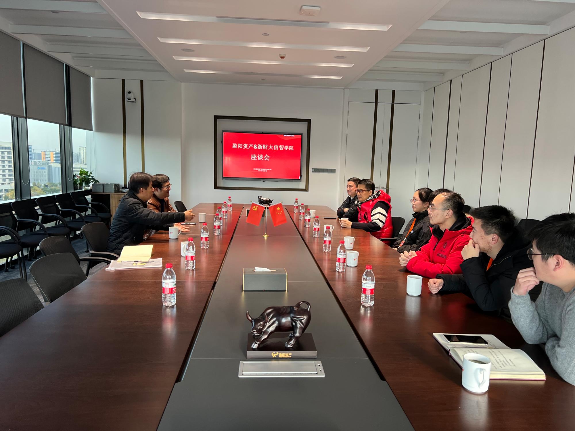 12月1日下午,学院经理张帅、党委书记徐奇伟一行三人前往浙江盈阳资产管理股份有限公司走访盈阳资产创始人楼栋员工、总经理孔繁岗员工并看望在公司基地实习的学院员工。